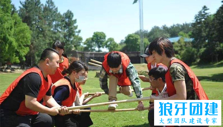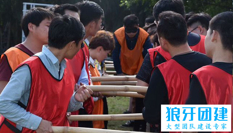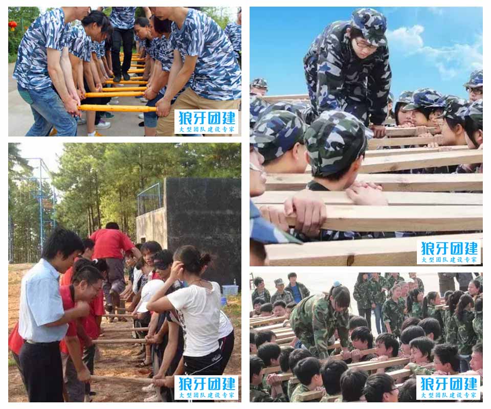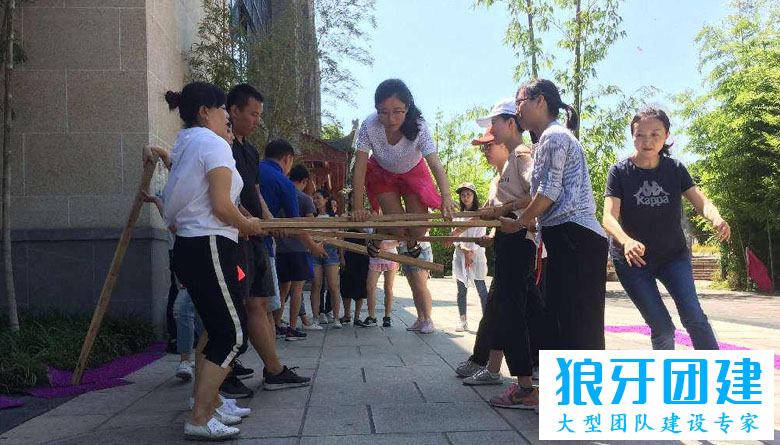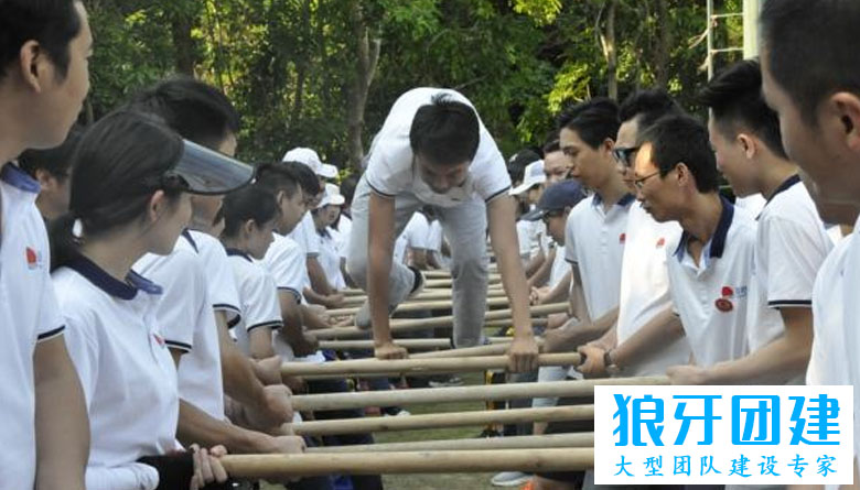 3、每对搭档双手紧握木棒,木棒与地面平行,这样整个形成了一个水平摆放的云梯。为了增强挑战难度,也可以安排每根梯线的高度略有不同,形成一定的起伏。